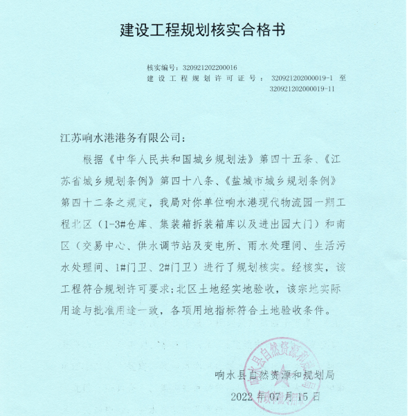 近日,響水港現(xiàn)代物流園一期工程順利通過規(guī)劃核實(shí)驗(yàn)收。