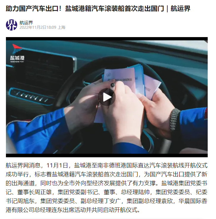 鹽城港至南非德班港國際直達(dá)汽車滾裝航線開航引發(fā)媒體廣泛關(guān)注