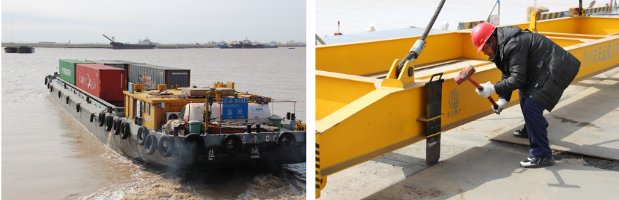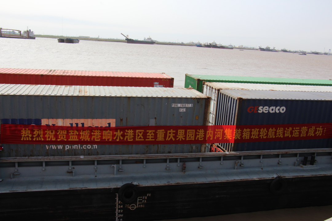 “嗚……”隨著汽笛的一聲長鳴,滿載集裝箱的“大港集003”號貨輪緩緩駛?cè)臌}城港響水港區(qū)5#泊位碼頭,貨船上的工作人員向岸邊拋出系泊纜繩固定貨船,碼頭上等待已久的吊機(jī)開始作業(yè),有條不紊地將集裝箱裝卸到拖車上。至此鹽城港響水港區(qū)至重慶果園港內(nèi)河集裝箱班輪航線試運(yùn)營成功,這是響水港區(qū)從“無”到“有”首次迎來的集裝箱貨輪。同時標(biāo)志著通榆河段阜寧至響水正式開通內(nèi)河集裝箱運(yùn)輸,掀開了鹽城港響水港區(qū)與阜寧港區(qū)“港港聯(lián)動”的全新篇章。