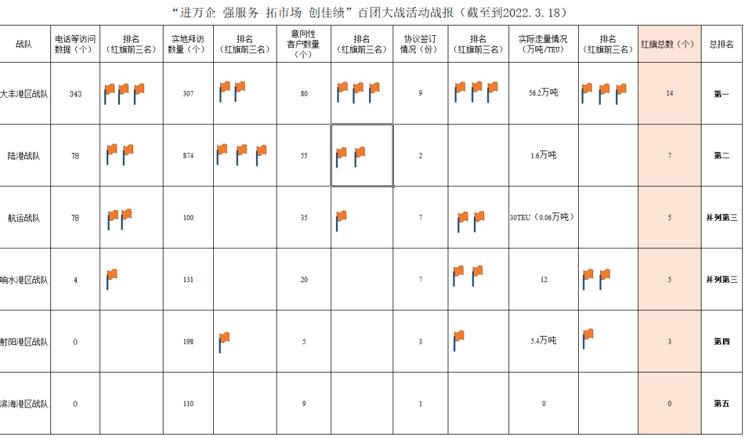 活動開展以來,累計拜訪客戶數(shù)量3633家,意向性客戶291家,簽訂協(xié)議數(shù)量42份,實際走量81.26萬噸、30TEU。
