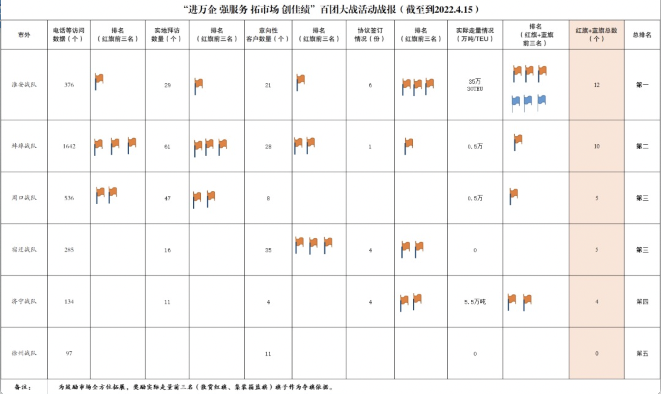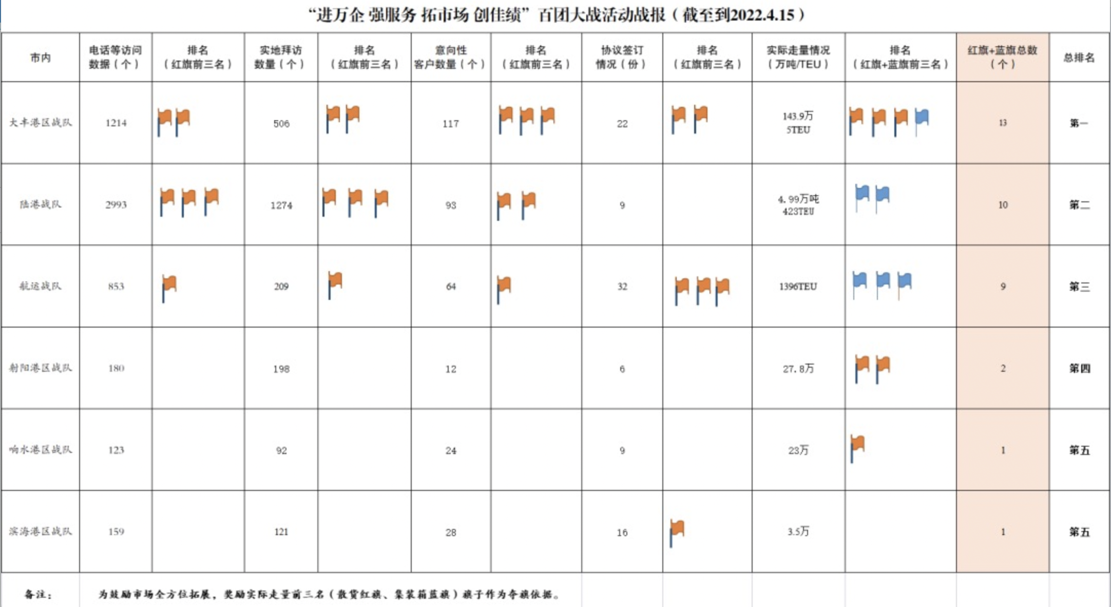 各戰(zhàn)隊(duì)拜訪客戶11156家,其中實(shí)地拜訪客戶2564家,電話、視頻、郵件等方式拜訪8592家,其中意向客戶445家,協(xié)議簽訂109份(其中云簽約19份),實(shí)際走量244.69萬噸(其中云簽約10萬噸),集裝箱1854TEU(其中云簽約153TEU)。