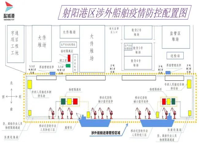 練內(nèi)功,行穩(wěn)筑基“守”規(guī)范。港區(qū)全面貫徹落實(shí)水路口岸疫情防控管理規(guī)定,嚴(yán)格按照涉外碼頭防控標(biāo)準(zhǔn),扎實(shí)推動(dòng)碼頭設(shè)備設(shè)施改造升級(jí)。港區(qū)根據(jù)水路口岸防控組審定的“射陽港區(qū)涉外船舶疫情防控配置圖”,改造完成了碼頭“三區(qū)兩通道”、“登輪人員梯口值守崗?fù)ぁ?、“界面管理崗?fù)ぁ钡扔布O(shè)施,擴(kuò)展提升了自有監(jiān)控覆蓋范圍,為射陽港區(qū)口岸對(duì)外開放后的涉外船舶“三位一體”管理工作打下堅(jiān)實(shí)基礎(chǔ)。
