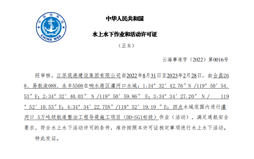 8月初,導(dǎo)堤工程項(xiàng)目施工單位網(wǎng)上申報(bào)水上水下活動(dòng)許可,在連云港海事局受理后,響水港區(qū)和項(xiàng)目管理公司通力合作,主動(dòng)靠前與施工單位對接協(xié)調(diào)施工船舶到港事項(xiàng),共同推動(dòng)施工船舶查驗(yàn)工作開展,為灌河口5萬噸級航道整治工程導(dǎo)堤施工項(xiàng)目獲批水上水下活動(dòng)許可證奠定了堅(jiān)實(shí)基礎(chǔ)。