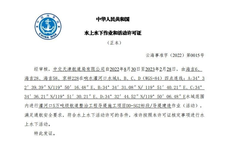 8月30日至31日,連云港海事局陸續(xù)簽發(fā)灌河口5萬噸級航道整治工程導(dǎo)堤施工一標(biāo)段和二標(biāo)段水上水下活動(dòng)許可證,標(biāo)志導(dǎo)堤工程施工前手續(xù)全部完成,為灌河口5萬噸級航道整治工程的全面開展邁出了重要一步。