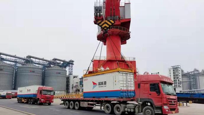 蘇北海豐大米“坐”進(jìn)集裝箱,通過鐵路運輸發(fā)往上海。