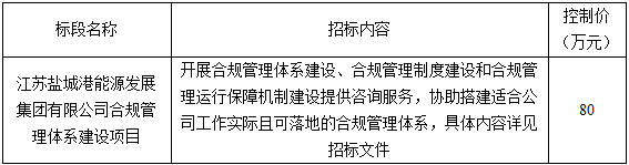 江蘇鹽城港能源發(fā)展集團(tuán)有限公司合規(guī)管理體系建設(shè)項(xiàng)目已經(jīng)相關(guān)部門批準(zhǔn)實(shí)施, 項(xiàng)目所需資金來源自籌已落實(shí)?,F(xiàn)決定對該項(xiàng)目進(jìn)行公開招標(biāo),擇優(yōu)選定承包人。