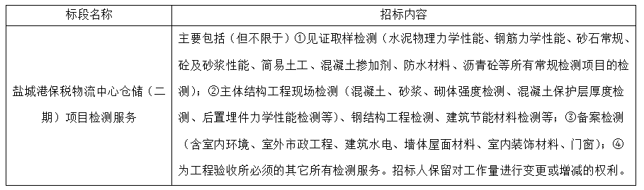 (7)項目標(biāo)段劃分:鹽城港保稅物流中心倉儲(二期)項目檢測服務(wù)共劃分1個標(biāo)段,標(biāo)段信息如下: