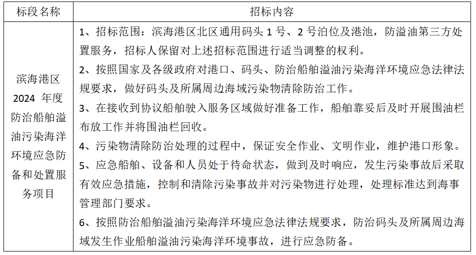 1、項(xiàng)目名稱:濱海港區(qū) 2024 年度防治船舶溢油污染海洋環(huán)境應(yīng)急防備和處置服務(wù)項(xiàng)目