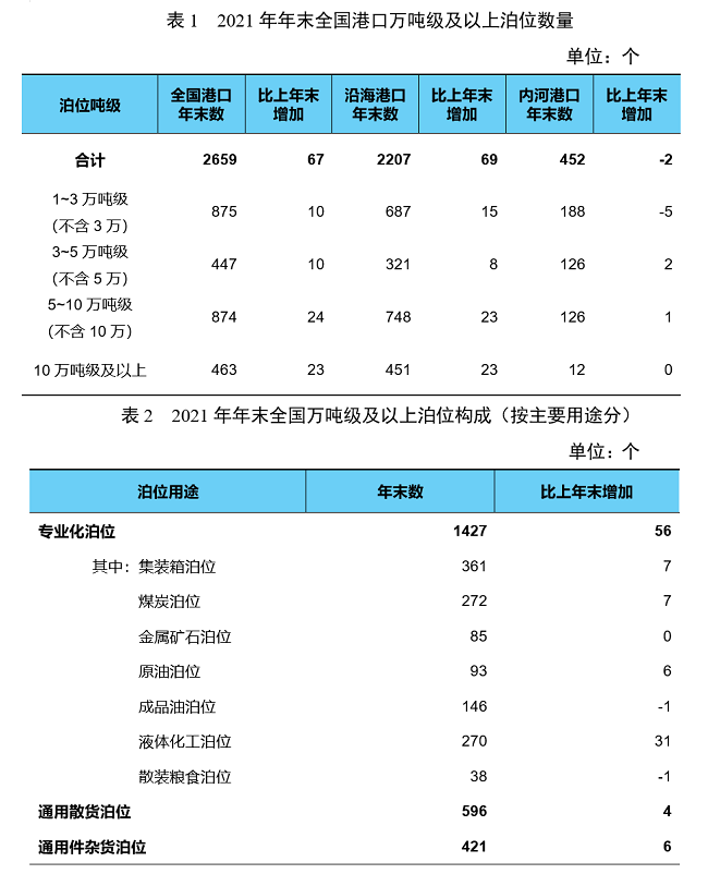 年末全國(guó)港口萬(wàn)噸級(jí)及以上泊位2659個(gè),比上年末增加67個(gè)。從分布結(jié)構(gòu)看,沿海港口萬(wàn)噸級(jí)及以上泊位2207個(gè)、增加69個(gè),內(nèi)河港口萬(wàn)噸級(jí)及以上泊位452個(gè)、減少2個(gè)。從用途結(jié)構(gòu)看,專業(yè)化萬(wàn)噸級(jí)及以上泊位1427個(gè)、增加56個(gè),通用散貨萬(wàn)噸級(jí)及以上泊位596個(gè)、增加4個(gè),通用件雜貨泊位421個(gè)、增加6個(gè)。