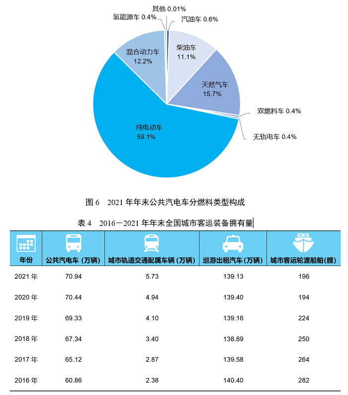 年末全國(guó)擁有城市公共汽電車70.94萬(wàn)輛,比上年末增長(zhǎng)0.7%,其中純電動(dòng)車41.95萬(wàn)輛、增長(zhǎng)10.8%,占整個(gè)城市公共汽電車比重為59.1%、提高5.4個(gè)百分點(diǎn)。擁有城市軌道交通配屬車輛5.73萬(wàn)輛,增長(zhǎng)15.9%。擁有巡游出租汽車139.13萬(wàn)輛,下降0.2%。擁有城市客運(yùn)輪渡船舶196艘,增長(zhǎng)1.0%。