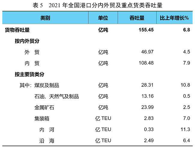 全年全國(guó)港口完成貨物吞吐量155.45億噸,比上年增長(zhǎng)6.8%。其中,內(nèi)河港口完成55.73億噸、增長(zhǎng)9.9%,沿海港口完成99.73億噸、增長(zhǎng)5.2%。完成集裝箱鐵水聯(lián)運(yùn)量754萬(wàn)TEU,增長(zhǎng)9.8%。