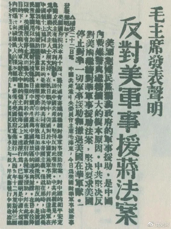 毛澤東以中共中央主席名義發(fā)表《反對(duì)美國(guó)對(duì)蔣軍事援助法案的聲明》。聲明指出:美國(guó)國(guó)務(wù)院于本月十四日提付國(guó)會(huì)審議的繼續(xù)對(duì)華軍事援助法案,對(duì)中國(guó)的和平安定與獨(dú)立民主有極為不利的影響,因此中國(guó)共產(chǎn)黨堅(jiān)決反對(duì)此項(xiàng)法案。中共此種意見,并為中國(guó)廣大民主人士所支持。在抗日戰(zhàn)爭(zhēng)中,美國(guó)對(duì)于中國(guó)實(shí)施軍事援助,并派遣美軍在中國(guó)領(lǐng)土上協(xié)同作戰(zhàn),其目的是擊敗中美的共同敵人日本帝國(guó)主義,但就在那時(shí),由于美國(guó)錯(cuò)誤地僅僅援助國(guó)民黨軍閥,這種援助也并未有效地加強(qiáng)中國(guó)的抵抗,相反地是被國(guó)民黨軍閥用以加強(qiáng)其對(duì)于積極抗日的中國(guó)共產(chǎn)黨與中國(guó)解放區(qū)的進(jìn)攻與封鎖。在日本投降以后,美國(guó)沒有停止反而極大地加強(qiáng)了對(duì)于中國(guó)國(guó)民黨政府的各種軍事援助,并在此實(shí)際目的下派遣龐大的軍隊(duì)駐在中國(guó)的領(lǐng)土與領(lǐng)海之上,這種行動(dòng)已經(jīng)證明是中國(guó)大規(guī)模內(nèi)戰(zhàn)爆發(fā)與繼續(xù)擴(kuò)大的根本原因。美國(guó)實(shí)行所謂軍事援助,實(shí)際上只是武裝干涉中國(guó)內(nèi)政,只是以強(qiáng)力支持國(guó)民黨獨(dú)裁政府繼續(xù)陷中國(guó)于內(nèi)戰(zhàn)、分裂、混亂、恐怖和貧困,只是使中國(guó)不能實(shí)現(xiàn)整軍復(fù)員和履行其對(duì)于聯(lián)合國(guó)的義務(wù),只是危害中國(guó)國(guó)家安全獨(dú)立與領(lǐng)土主權(quán)完整,只是破壞中美兩大民族的光榮友誼與中美貿(mào)易的發(fā)展前途。在此種現(xiàn)實(shí)情況之下,中國(guó)共產(chǎn)黨不得不堅(jiān)決反對(duì)美國(guó)政府繼續(xù)以出售、交換、租借、贈(zèng)送或讓渡等方式將軍火交給中國(guó)的國(guó)民黨獨(dú)裁政府,堅(jiān)決反對(duì)美國(guó)派遣軍事使團(tuán)來華,并堅(jiān)決要求美國(guó)立即停止與收回對(duì)華的一切所謂軍事援助,和立即撤回在華的美國(guó)軍隊(duì)。