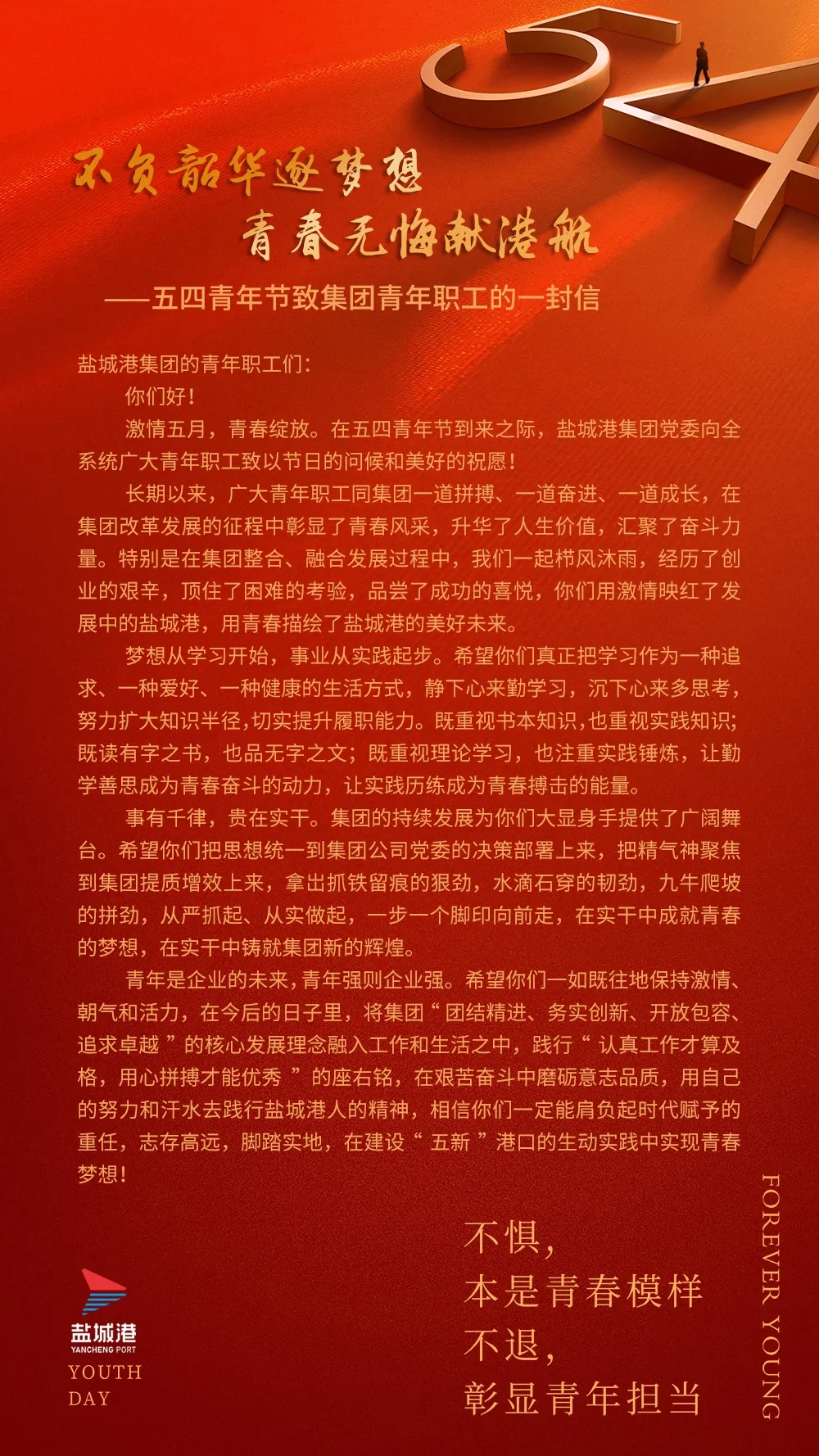 火紅青春,激情五四。今年是紀念五四運動102周年,5月7日,鹽城港集團組織開展“五四”青年節(jié)紀念活動,持續(xù)推進黨史學習教育,匯聚青春正能量,激勵廣大青年干部在黨史學習教育中深刻感悟五四愛國精神,賡續(xù)使命、接續(xù)奮斗,為新時代港航事業(yè)貢獻青春之力。系統(tǒng)內(nèi)各港區(qū)、各板塊、鹽城港引航站、機關(guān)各部門100余名青年同志參加。