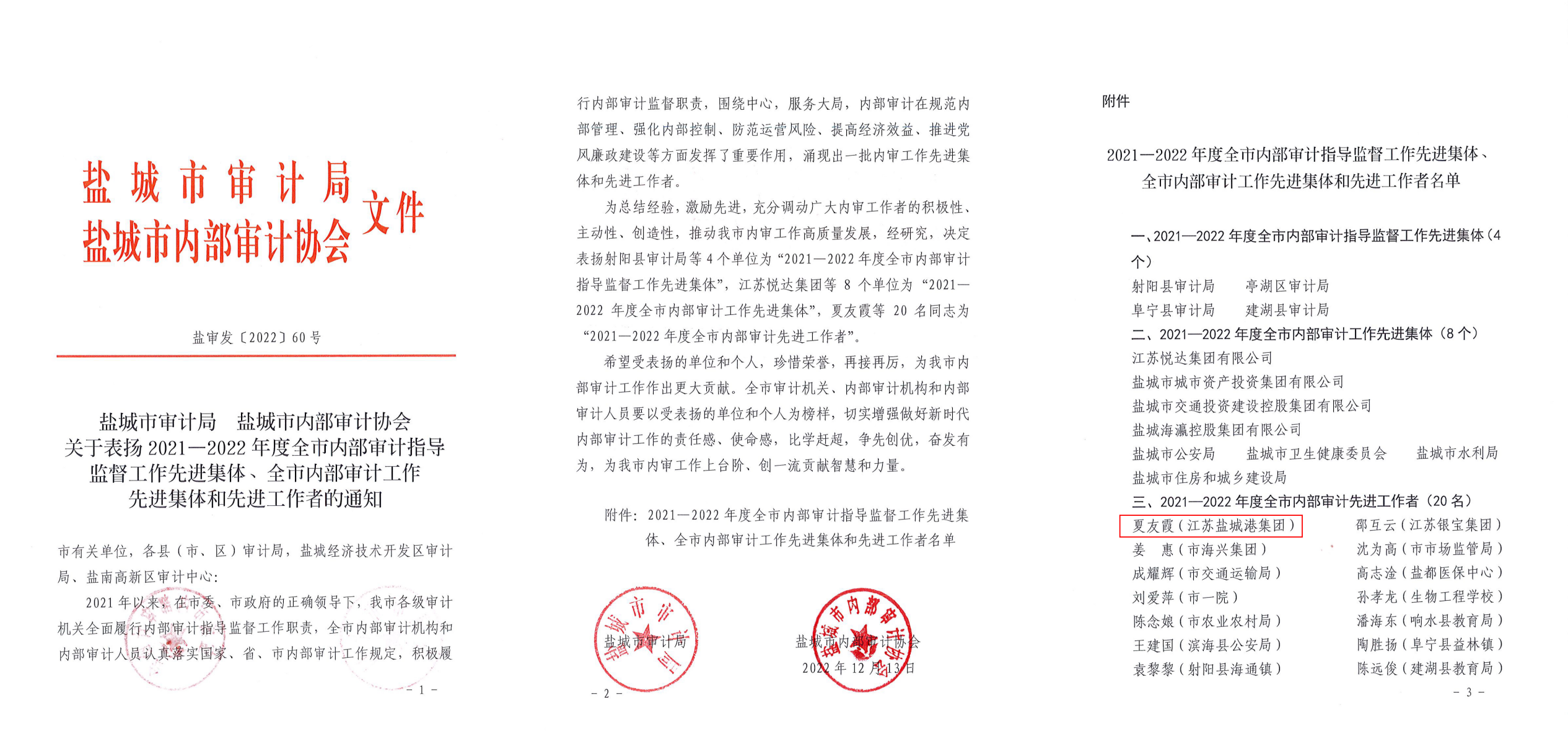近日,鹽城市審計局、鹽城市內(nèi)部審計協(xié)會聯(lián)合發(fā)布關(guān)于表揚2021-2022年度全市內(nèi)部審計指導(dǎo)監(jiān)督工作先進(jìn)集體、全市內(nèi)部審計工作先進(jìn)集體和先進(jìn)工作者的通知,集團(tuán)副總審計師夏友霞榮獲“2021-2022年度全市內(nèi)部審計先進(jìn)工作者”榮譽稱號。