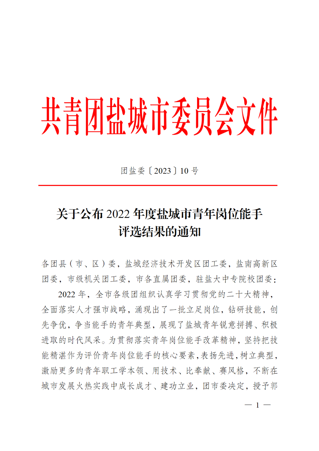 近日,共青團(tuán)鹽城市委發(fā)布《關(guān)于公布2022年度鹽城市青年崗位能手評(píng)選結(jié)果的通知》,集團(tuán)丁浩明、龔海衛(wèi)、李睿三名青年同志榮獲“2022年度鹽城市青年崗位能手”稱號(hào)。