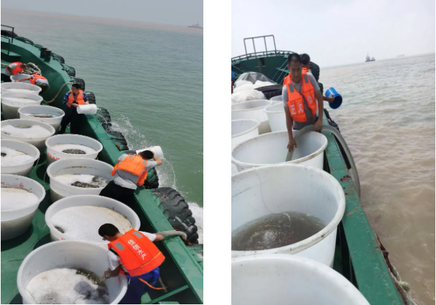 活動過程中,省海洋水產(chǎn)研究所中心實驗室、濱??h農(nóng)業(yè)農(nóng)村局、濱??h公證處工作人員全程參與,現(xiàn)場核查種苗數(shù)量、規(guī)格、質(zhì)量,辦理現(xiàn)場驗收手續(xù),并乘坐貨輪前往放流海域共同見證放養(yǎng)種苗,以實現(xiàn)海洋資源恢復,改善海洋生態(tài)環(huán)境。
