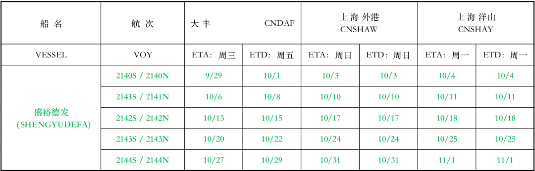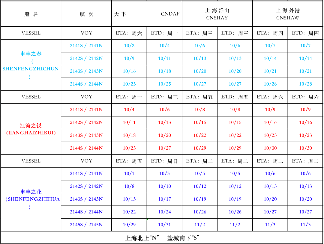 滬鹽專(zhuān)線2021年10月份沿海線船期表