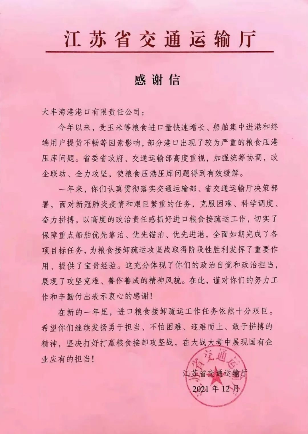 12月21日,省交通運(yùn)輸廳向集團(tuán)下屬港口公司發(fā)來感謝信,對港口公司面對新冠肺炎疫情和艱巨繁重的任務(wù),克服困難、科學(xué)調(diào)度,努力抓好進(jìn)口糧食接疏運(yùn)工作,以及廣大干部職工的努力工作和辛勤付出表示感謝。