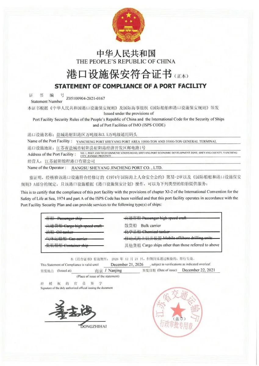 12月21日,經(jīng)過射陽港區(qū)項(xiàng)目條線人員近三個(gè)月的不懈努力,在各主管部門和專業(yè)咨詢單位的支持配合下,鹽城港射陽港區(qū)順利取得江蘇省交通運(yùn)輸廳核發(fā)的港口設(shè)施保安符合證書,這一證書的成功獲批,為射陽港區(qū)一類開放口岸國(guó)家級(jí)驗(yàn)收奠定了堅(jiān)實(shí)基礎(chǔ)。