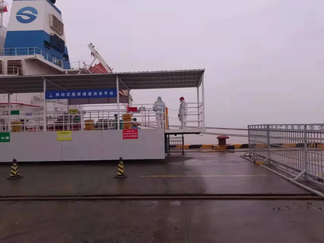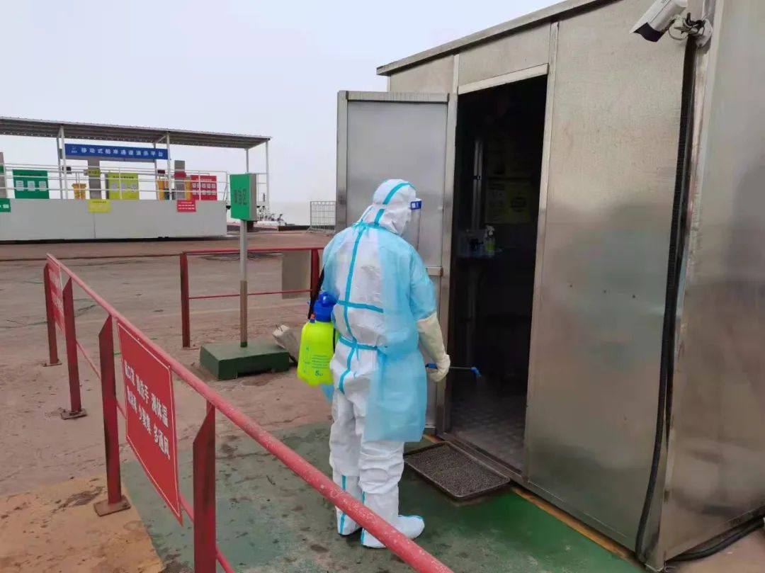 嚴(yán)格執(zhí)行人員準(zhǔn)入制度,進(jìn)出人員需佩戴口罩,并進(jìn)行體溫測(cè)量、信息登記、蘇康碼及行程碼核查。安排專人定時(shí)對(duì)碼頭登梯口、防疫值守崗?fù)ぁ⒚撔秴^(qū)、專班集中居住區(qū)、專班人員運(yùn)輸車輛、電梯、門把手、食堂等重點(diǎn)場(chǎng)所進(jìn)行清潔消毒。碼頭設(shè)立固定的巡查人員24小時(shí)巡查,同時(shí)外輪靠泊期間,嚴(yán)格落實(shí)卡口、登輪梯口24小時(shí)專人值守,強(qiáng)化梯口管理,對(duì)所有登輪人員進(jìn)行核實(shí)登記,監(jiān)督人員防護(hù)措施落實(shí)情況,凡是通過梯口人員,必須提供48小時(shí)內(nèi)有效核酸檢測(cè)證明、疫苗接種證明。