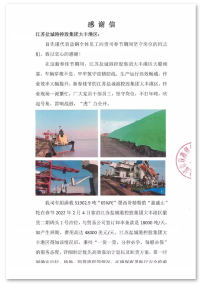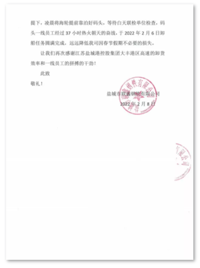 新年伊始,喜事連連。近日,鹽城港大豐港區(qū)港口公司收到鹽城市聯鑫鋼鐵有限公司送來的一封感謝信,對港口公司為客戶著想,以客戶至上,以一流專業(yè)的服務和生產組織能力、追求卓越的工作精神,高質高效幫助客戶圓滿完成卸船任務表示由衷感謝。