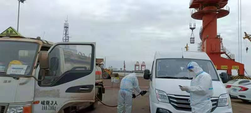 初春的早晨,寒風(fēng)依然刺骨,成品油公司防疫供油專車卻已早早地等候在大豐港二期碼頭。“師傅,您好,成品油公司防疫供油專車申請(qǐng)進(jìn)碼頭供油,這是‘雙碼’、核酸檢測(cè)結(jié)果......”這是成品油公司供油專車進(jìn)出港口的景象。