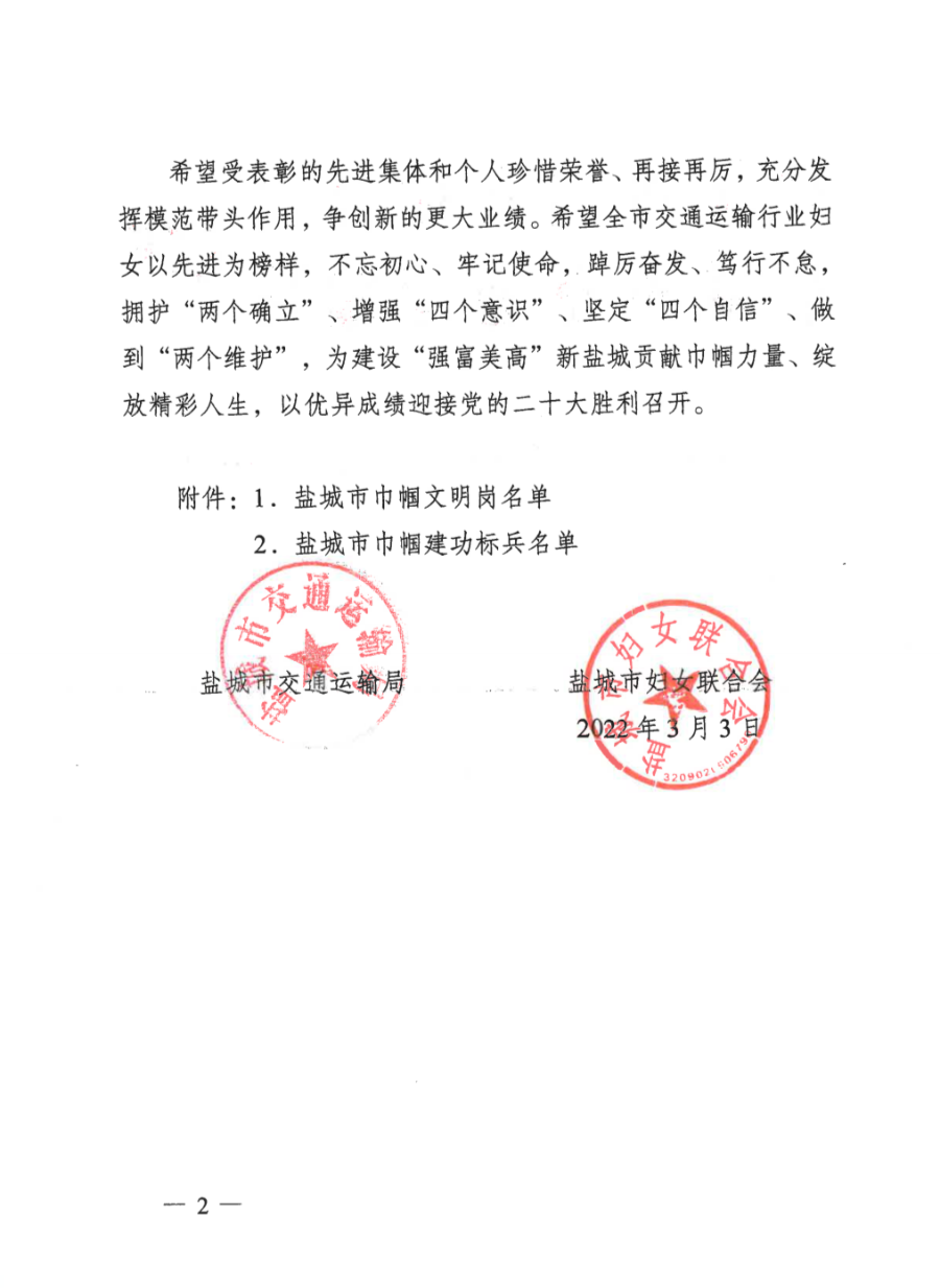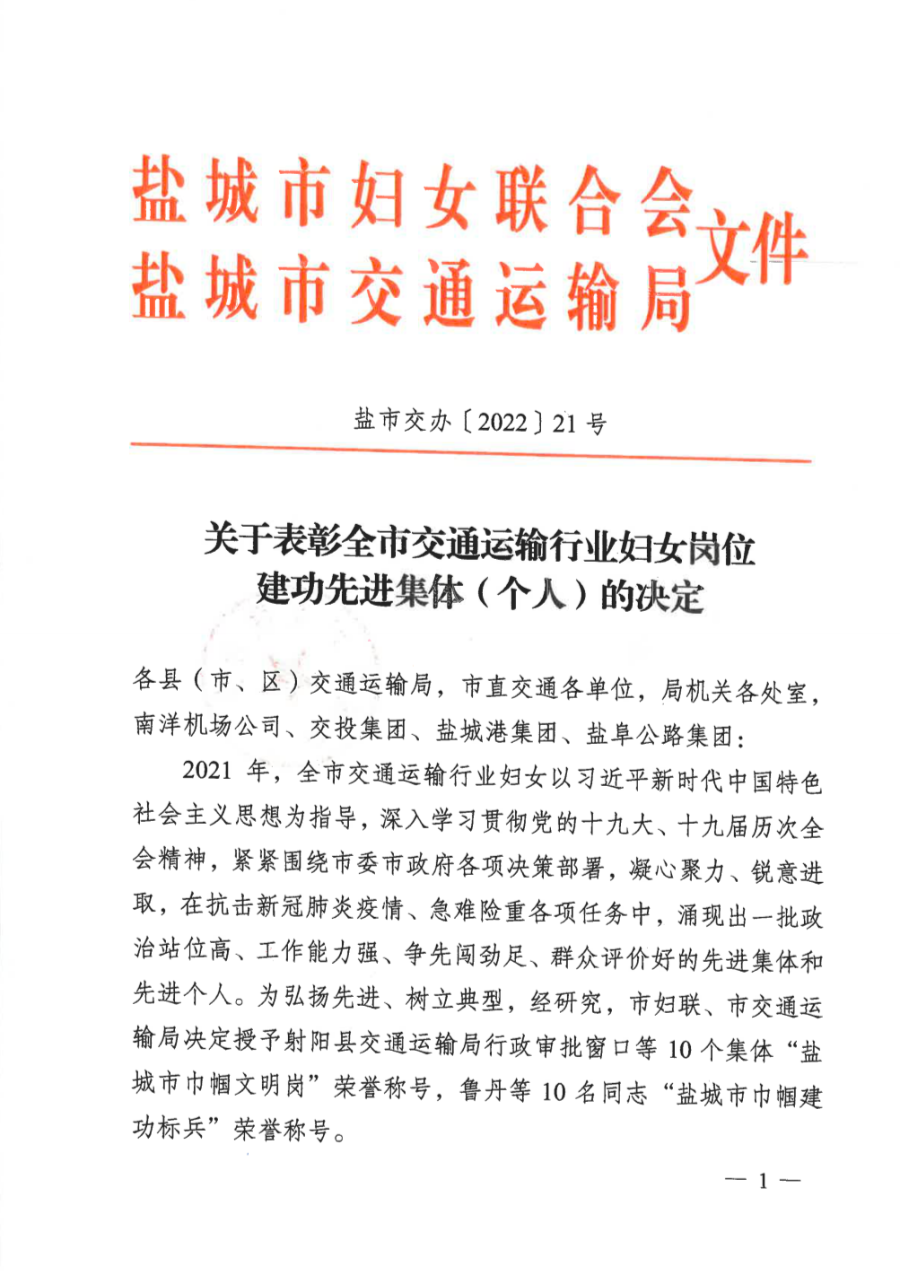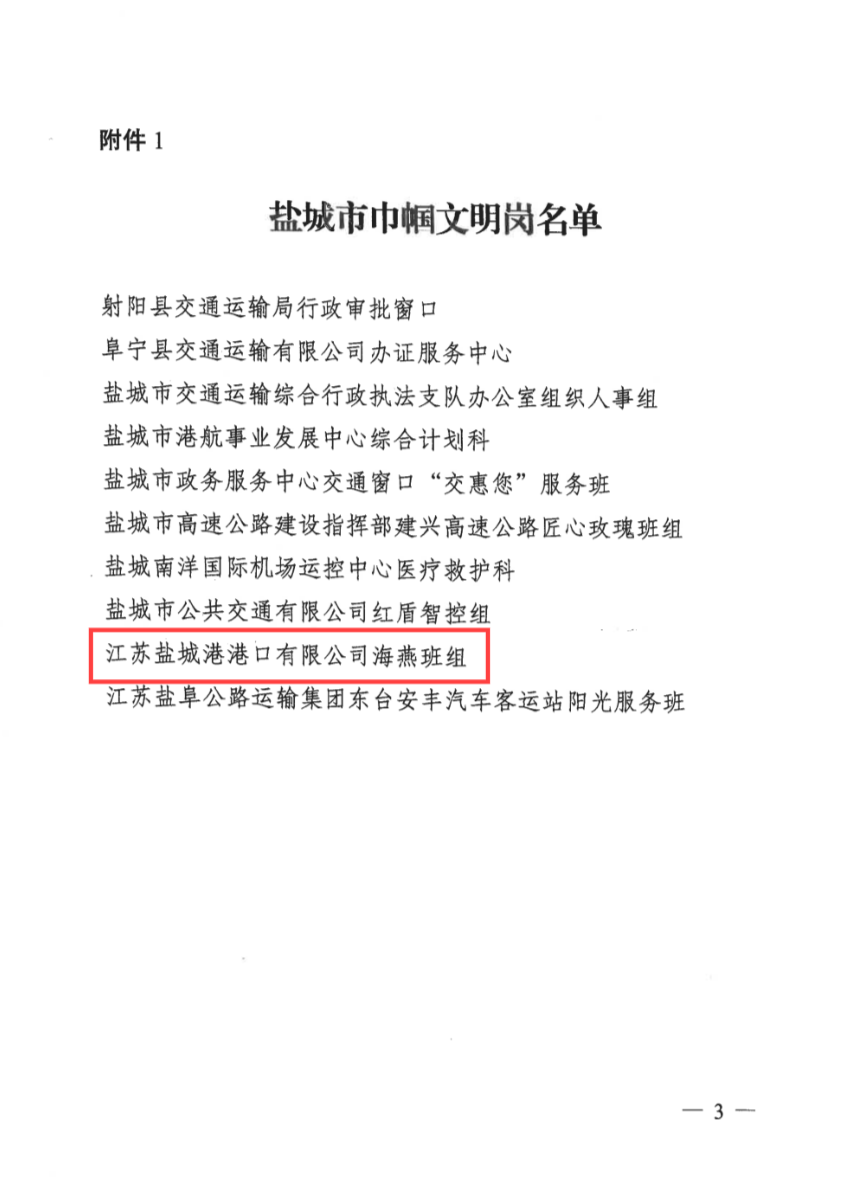 近日,市婦聯(lián)、市交通運(yùn)輸局聯(lián)合發(fā)布《關(guān)于表彰全市交通運(yùn)輸行業(yè)婦女崗位建功先進(jìn)集體(個(gè)人)的決定》,鹽城港港口公司“海燕”班組榮獲“鹽城市巾幗文明崗”榮譽(yù)稱號(hào)。