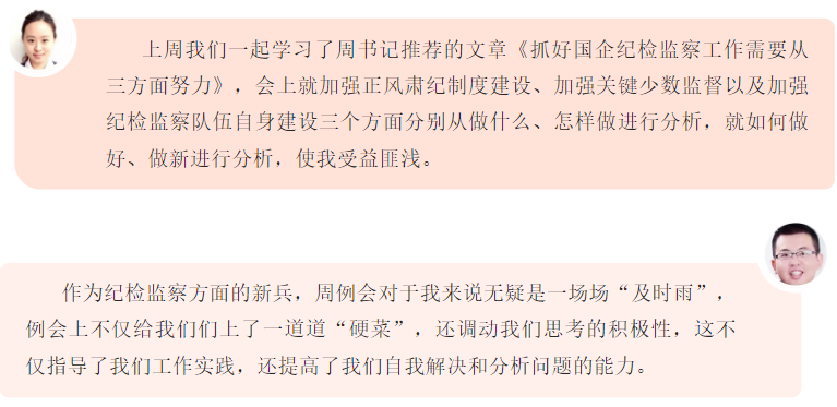 紀(jì)檢監(jiān)察業(yè)務(wù)周例會(huì)是大豐港區(qū)提高紀(jì)檢條線工作能力的方式,也是建設(shè)學(xué)習(xí)型紀(jì)檢干部的有效嘗試。“學(xué)習(xí)要有干貨,不能搞花架子,要了解我們的干部最需要學(xué)什么,緊貼實(shí)際需求和工作要求來(lái)安排學(xué)習(xí)內(nèi)容?!贝筘S港區(qū)紀(jì)檢相關(guān)負(fù)責(zé)人表示,深化監(jiān)察體制改革,對(duì)紀(jì)檢監(jiān)察干部的業(yè)務(wù)能力提出了更高更嚴(yán)的要求,學(xué)習(xí)就是要著力補(bǔ)短板、強(qiáng)弱項(xiàng),解決紀(jì)檢監(jiān)察干部本領(lǐng)“恐慌”問(wèn)題。例會(huì)上,就集團(tuán)紀(jì)委下發(fā)文件精神進(jìn)行剖析、對(duì)日常監(jiān)督如何抓、信息宣傳選題立意、特色亮點(diǎn)提煉歸納進(jìn)行培訓(xùn)。會(huì)上還提倡“我的問(wèn)題大家答”,組織交流討論、現(xiàn)場(chǎng)解答,鼓勵(lì)善于發(fā)現(xiàn)問(wèn)題,積極解決問(wèn)題,創(chuàng)新理念思路,確??梢浴俺潆娧a(bǔ)能”,提升業(yè)務(wù)能力。