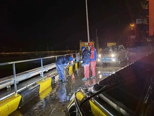 為了保障滾裝作業(yè)順利完成,糧食碼頭分公司檢修人員以車燈為照明,冒著大風(fēng)大雨檢修線路。