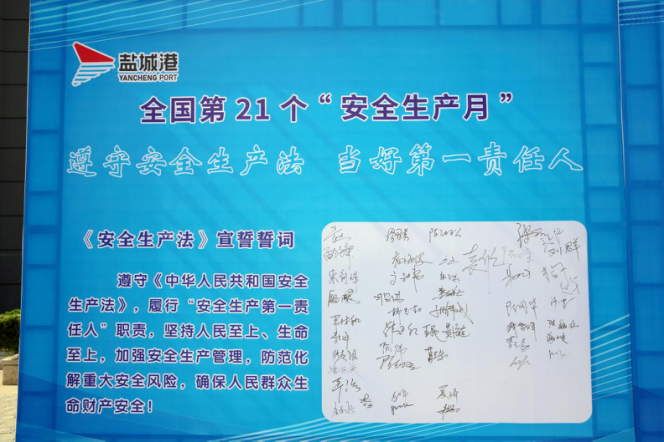 今年6月是全國第21個、全省第29個“安全生產(chǎn)月”,主題是“遵守安全生產(chǎn)法、當好第一責任人”。為促進安全生產(chǎn)形勢持續(xù)穩(wěn)定向好,保障鹽城港集團“經(jīng)營興航年”各項目標指標順利完成,按照鹽城港集團統(tǒng)一部署,6月2日,大豐港區(qū)舉行2022年安全生產(chǎn)月宣誓承諾活動。大豐港區(qū)各二級公司班子成員及安全條線人員參加。