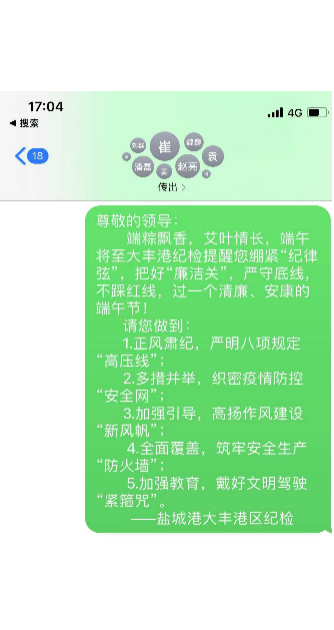 鹽城港大豐港區(qū)紀檢精心編輯與廉潔從政、清廉家風(fēng)有關(guān)的廉政短信和廉潔提醒,在元旦、春節(jié)、清明、端午等重要節(jié)點前發(fā)送給全體干部職工,教育警示廣大干部職工知敬畏、存戒懼、守底線。