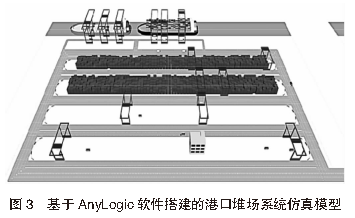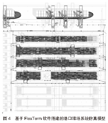 3.2 堆場仿真系統(tǒng)模型根據(jù)堆場仿真系統(tǒng)架構,以某港口自動化堆場作業(yè)的實際運行環(huán)境為基礎,分別搭建基于AnyLogic軟件和FlexTerm軟件的港口自動化堆場系統(tǒng)仿真模型。基于AnyLogic軟件搭建的港口堆場系統(tǒng)仿真模型見圖3,基于FlexTerm軟件搭建的港口堆場系統(tǒng)仿真模型見圖4。