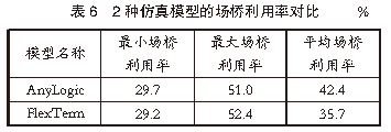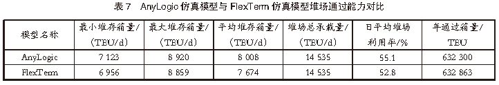 經(jīng)綜合分析發(fā)現(xiàn),無論是單一場橋利用率還是平均場橋利用率,AnyLogic仿真模型的數(shù)據(jù)結果都普遍高于FlexTerm仿真模型的數(shù)據(jù)結果。通過分析堆場作業(yè)系統(tǒng)仿真流程發(fā)現(xiàn),上述差異是由2種仿真模型的作業(yè)指令生成模式不同導致的。在相同的作業(yè)時段內,AnyLogic仿真模型的作業(yè)指令生成的作業(yè)數(shù)量要高于FlexTerm仿真模型的作業(yè)指令生成的作業(yè)數(shù)量,從而導致AnyLogic仿真模型的場橋利用率高于FlexTerm仿真模型的場橋利用率。根據(jù)港口提供的數(shù)據(jù),全年該港口自動化堆場的場橋利用率在40%~60%?;贏nyLogic仿真模型和FlexTerm仿真模型仿真得到的平均場橋利用率分別為42.4%、35.7%。顯然,與FlexTerm仿真模型的仿真結果相比,AnyLogic仿真模型的仿真結果同實際作業(yè)數(shù)據(jù)的統(tǒng)計結果更接近。究其原因,這是由2款仿真模型的集裝箱裝卸作業(yè)指令的生成模式不同導致的。對堆場作業(yè)系統(tǒng)仿真流程分析發(fā)現(xiàn):在AnyLogic仿真模型中,集裝箱裝卸作業(yè)指令是根據(jù)港口歷史數(shù)據(jù),借助算法計算生成的,比較接近港口的實際作業(yè)數(shù)據(jù);在FlexTerm仿真模型中,集裝箱裝卸作業(yè)指令是利用軟件自帶作業(yè)計劃模塊,通過配置船期、堆場計劃等參數(shù)自動生成的,與港口實際作業(yè)數(shù)據(jù)之間存在一定的差距。4.2 堆場使用情況對比為了合理規(guī)劃堆場空間資源,根據(jù)港口提供的船期、堆場計劃等參數(shù),對港口堆場的使用情況進行仿真對比分析。AnyLogic仿真模型與FlexTerm仿真模型堆場通過能力對比見表7。由表7可知,在相同輸入條件下,AnyLogic仿真模型和FlexTerm仿真模型仿真模擬得到的堆場利用情況和堆場通過能力基本一致。但由于泊位船舶計劃較為寬松,船期密度小于實際船期數(shù)據(jù),AnyLogic仿真模型和FlexTerm仿真模型的堆場通過箱量分別為632 300 TEU和632 863 TEU,均小于港口全年實際堆場通過箱量724 272 TEU。