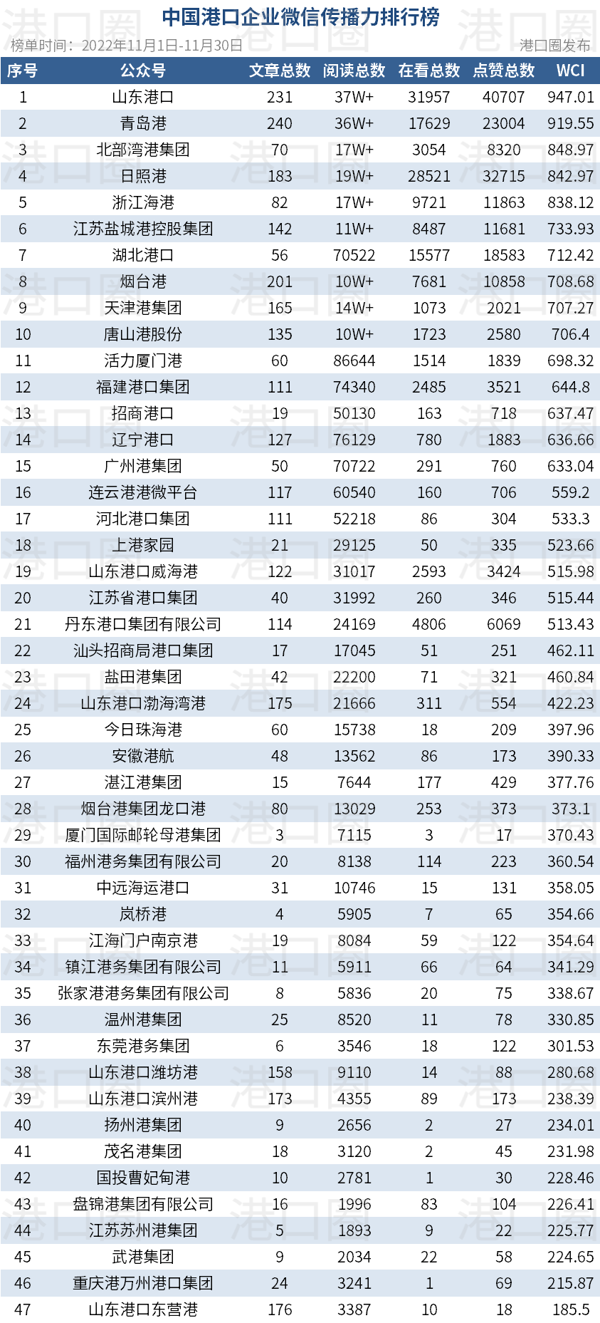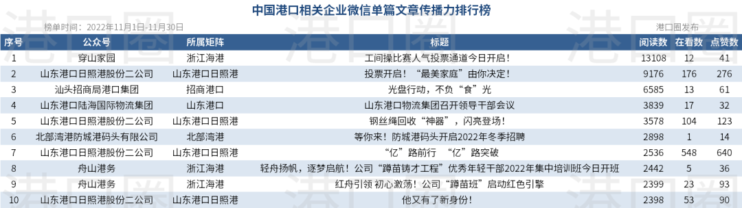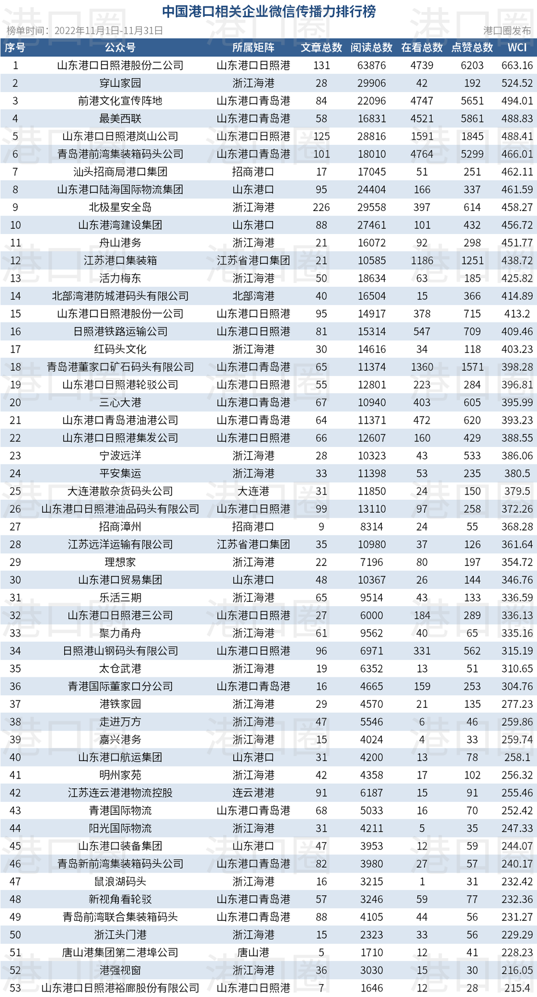 2022年11月,中國港口企業(yè)微信傳播力排行榜前十名為:山東港口(第1)、青島港(第2)、北部灣港集團(第3)、日照港(第4)、浙江海港(第5)、江蘇鹽城港控股集團(第6)、湖北港口(第7)、煙臺港(第8)、天津港集團(第9)、唐山港股份(第10)。