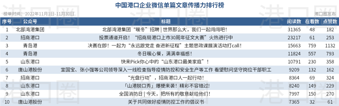 本月的微信單篇文章傳播力排行榜中,共有北部灣港集團、招商港口、青島港、山東港口、唐山港股份五家港口企業(yè)上榜。招商港口在11月中轉(zhuǎn)變發(fā)文策略,由多向精,其中《“光盤行動”,招商港口人一起行動》通過企業(yè)影響力號召員工深度參與光盤行動,踐行企業(yè)社會責任。此外,山東港口發(fā)布的《【山港脫口秀】爆梗來襲!精彩不容錯過》一文,以視頻方式展出員工的各個“山港段子”,不僅有趣好玩,也在無形中加深了員工的企業(yè)認同感,是一次成功的宣傳樣板。