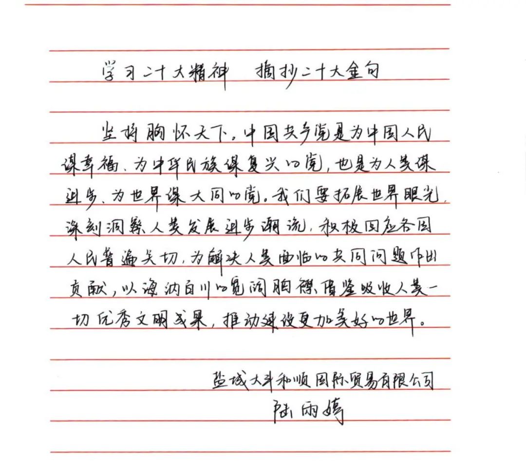 通過手抄黨的二十大報(bào)告“金句”的學(xué)習(xí)形式,促使全體黨員干部做到“抄中學(xué)、學(xué)中思、思中悟、悟中踐”,做到“真學(xué)習(xí)、真理解、真學(xué)懂、真學(xué)通”,并以更昂揚(yáng)的斗志、更扎實(shí)的作風(fēng)投身到鹽城港航事業(yè)高質(zhì)量發(fā)展中,為集團(tuán)健康可持續(xù)發(fā)展持續(xù)發(fā)力。