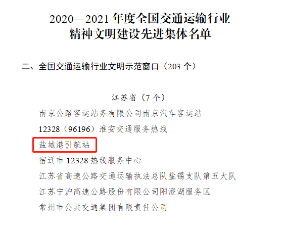 近日,交通運輸部印發(fā)《關(guān)于命名2020—2021年度全國交通運輸行業(yè)精神文明建設先進集體的決定》,鹽城港引航站作為2018—2019年度“全國交通運輸行業(yè)文明示范窗口”經(jīng)過復核確認,繼續(xù)保留稱號,且是我市唯一獲得該項榮譽的單位。