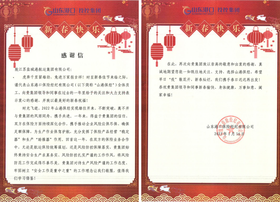 新歲序開,同赴新程。近日,集團下屬江蘇鹽城港大豐港開發(fā)集團、江蘇鹽城港港口公司、江蘇鹽城港航運集團三家單位分別收到來自山東港口保險經(jīng)紀(jì)公司的感謝信。紙短情長,字字暖心。一封封感謝信,道出了鹽城港和山東港攜手發(fā)展的深厚情誼。