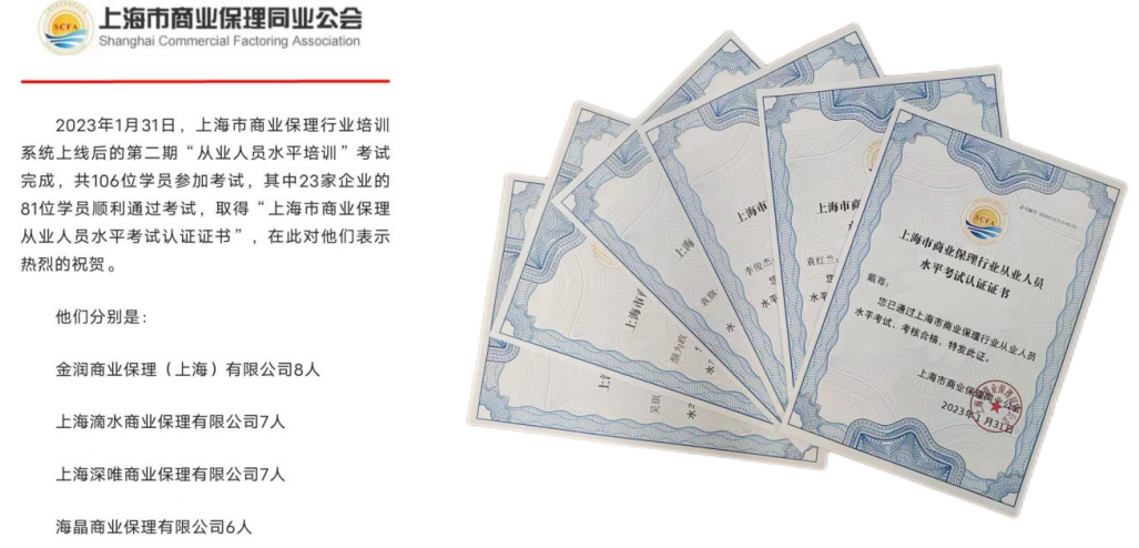 近日,海晶商業(yè)保理有限公司6名員工參加上海市商業(yè)保理水平培訓,順利通過考試并取得認證證書。考試通過人次在上海市商業(yè)保理行業(yè)名列前茅,充分展示了出色的專業(yè)水準。