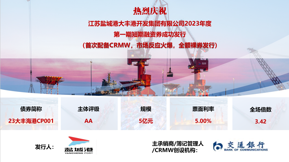 4月28日,大豐港開發(fā)集團2023年度第一期短期融資券成功發(fā)行,發(fā)行規(guī)模5億元,發(fā)行利率5%,全場認購3.42倍,創(chuàng)大豐港開發(fā)集團近幾年來債券融資成本最低。本期債券,創(chuàng)新通過交通銀行風險緩釋憑證吸引了投資熱度。債券的成功發(fā)行充分反映了投資機構對鹽城港集團發(fā)展的高度認可,進一步提振了資本市場對鹽城港航事業(yè)發(fā)展的信心。