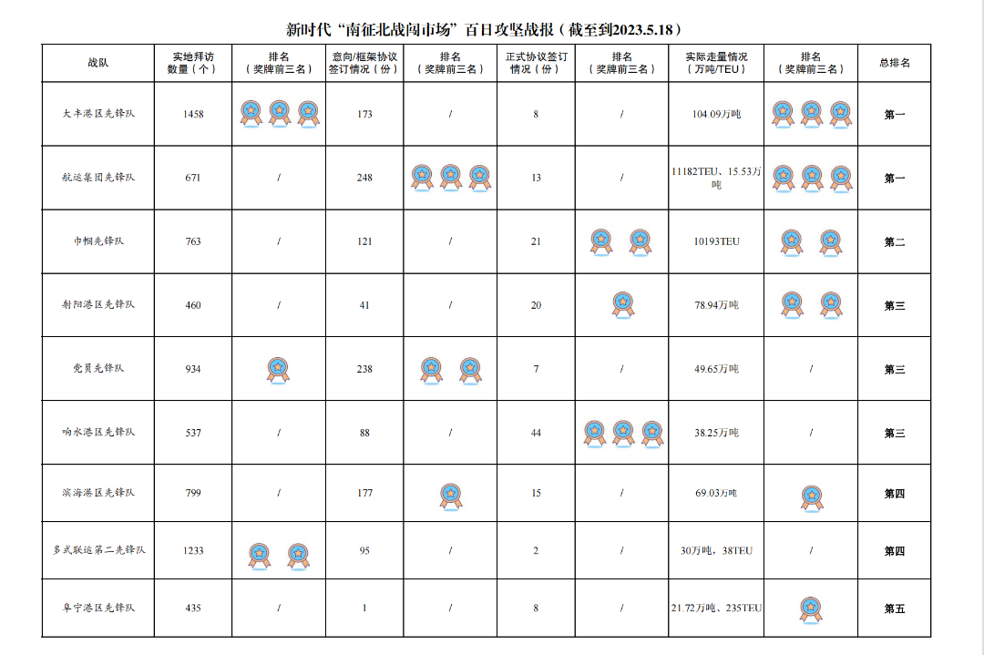 創(chuàng)新方式,激發(fā)活力。于5月15日成功舉辦新時代“南征北戰(zhàn)闖市場”響水港集團—國際陸港集團“海河聯(lián)運”客戶簽約會,共簽訂30份正式協(xié)議,預計年中轉(zhuǎn)量680萬噸,預計年營收3645萬元;于5月18日成功舉辦新時代“南征北戰(zhàn)闖市場”射陽港區(qū)客戶簽約會,共簽訂11份正式協(xié)議,預計年中轉(zhuǎn)量240萬噸、風電葉片153套,預計年營收3000萬元。