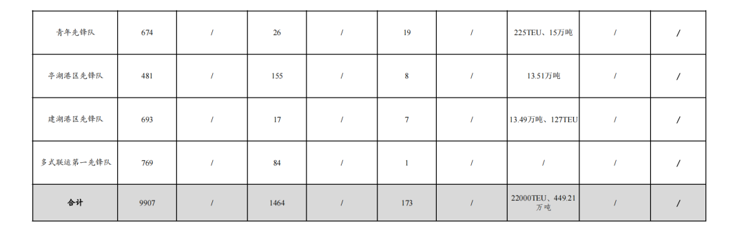 4.實際走量18601TEU、436.71萬噸:其中大豐港區(qū)先鋒隊104.09萬噸,航運集團先鋒隊11182TEU、15.53萬噸,射陽港區(qū)先鋒隊78.94萬噸,巾幗先鋒隊10193TEU,濱海港區(qū)先鋒隊69.03萬噸,阜寧港區(qū)先鋒隊21.72萬噸、235TEU,黨員先鋒隊49.65萬噸,青年先鋒隊225TEU、15萬噸,響水港區(qū)先鋒隊38.25萬噸,建湖港區(qū)先鋒隊13.49萬噸、127TEU,亭湖港區(qū)先鋒隊13.51萬噸,多式聯(lián)運第二先鋒隊30萬噸,38TEU。