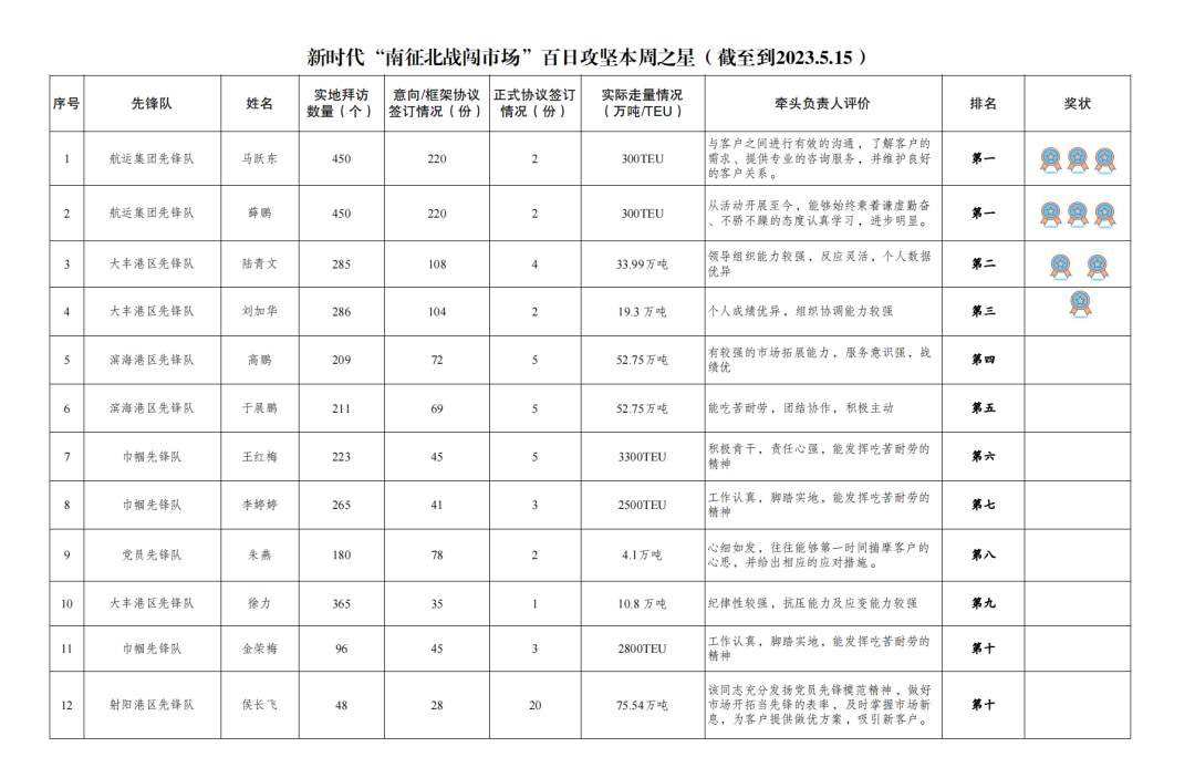 第一名:航運集團先鋒隊 馬躍東、薛鵬(拜訪客戶450家,簽訂意向協(xié)議220份,簽訂正式協(xié)議2份,實際走量300TEU)