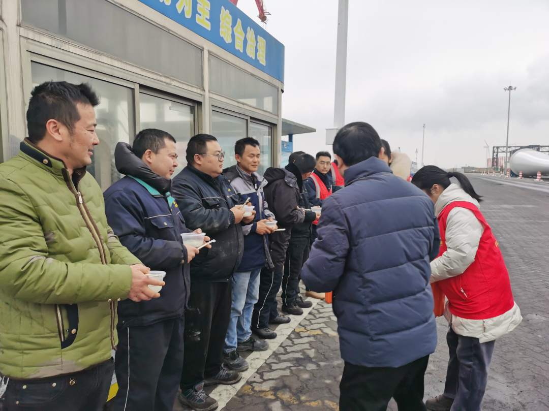 頂著凜冽寒風,射陽港區(qū)工會為大家送上熱氣騰騰的芝麻湯圓。每一顆香甜軟糯的湯圓都包含著衷心的祝福,醞釀著前行的暖意。