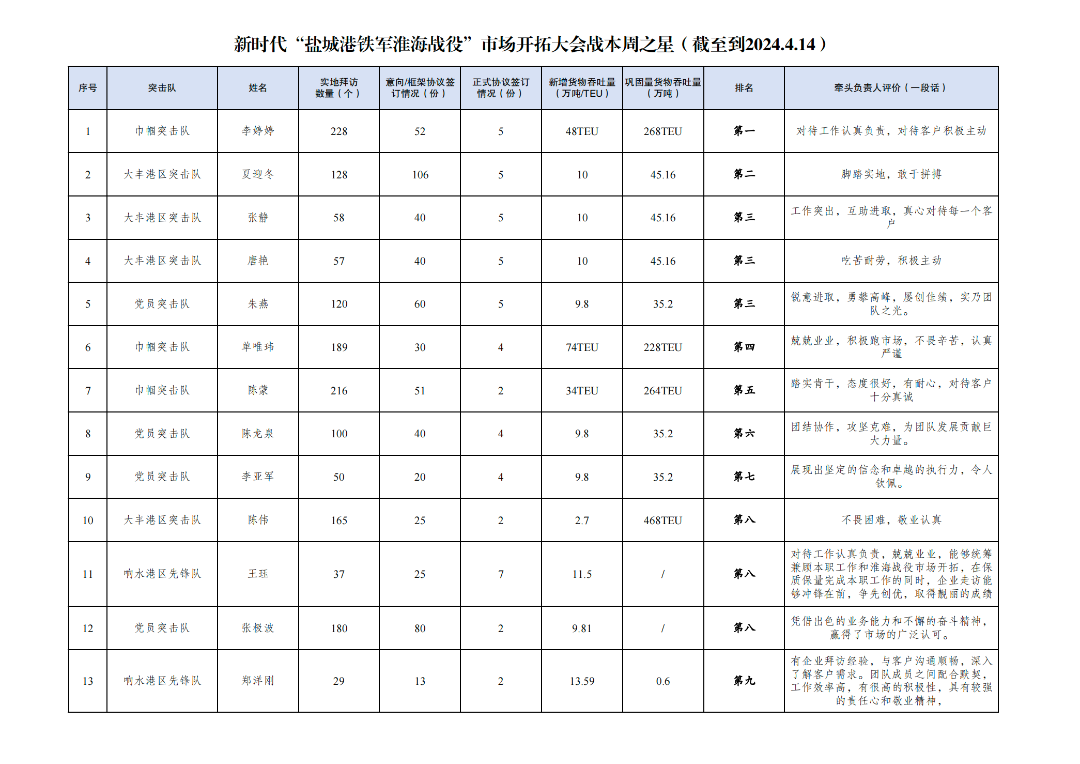 1.累計(jì)拜訪客戶數(shù)量4921家:其中大豐港區(qū)突擊隊(duì)935家,響水港區(qū)突擊隊(duì)392家,巾幗突擊隊(duì)382家,射陽(yáng)港區(qū)突擊隊(duì)377家,阜寧港區(qū)突擊隊(duì)362家,多式聯(lián)運(yùn)第一突擊隊(duì)352家,航運(yùn)集團(tuán)突擊隊(duì)339家,亭湖港區(qū)突擊隊(duì)329家,青年突擊隊(duì)324家,多式聯(lián)運(yùn)第二突擊隊(duì)307家,黨員突擊隊(duì)287家,建湖港區(qū)突擊隊(duì)276家,濱海港區(qū)突擊隊(duì)259家。