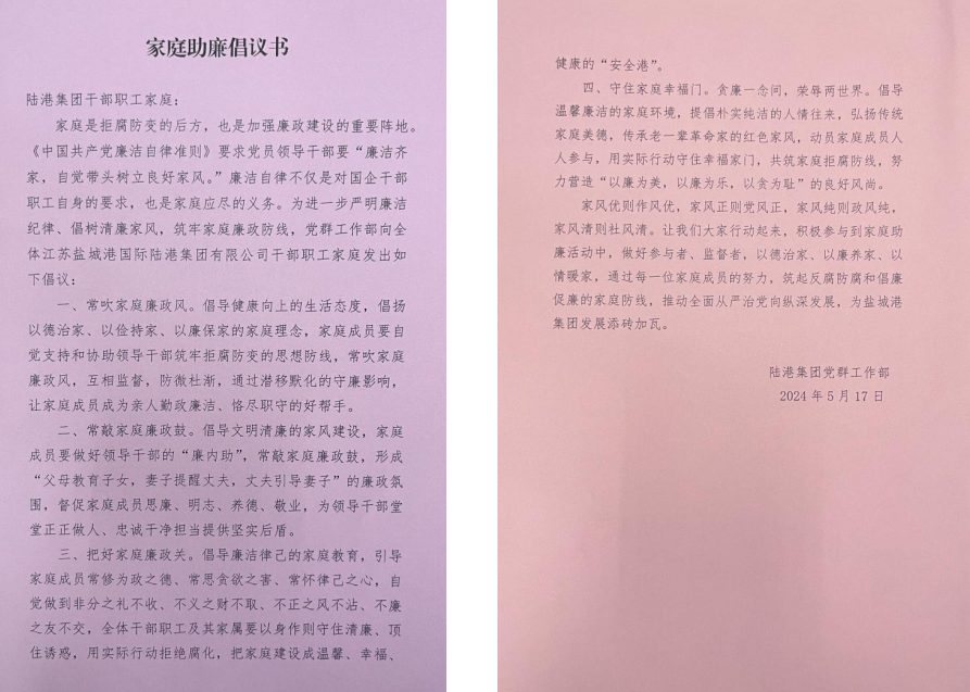 家庭齊心助廉?!盀檫M(jìn)一步嚴(yán)明廉潔紀(jì)律、筑牢家庭廉政防線,黨群工作部向全體陸港集團(tuán)干部職工家庭發(fā)出如下倡議……”在警示教育大會(huì)上,陸港集團(tuán)黨群工作部向全體干部職工發(fā)出了《家庭助廉倡議書(shū)》,引導(dǎo)干部職工家屬常吹“家庭廉潔風(fēng)”,做好“家庭廉內(nèi)助”,把好“家庭廉潔門(mén)”,以清廉家風(fēng)抵御腐敗歪風(fēng),齊心協(xié)力,共同織密“家庭護(hù)廉網(wǎng)”。