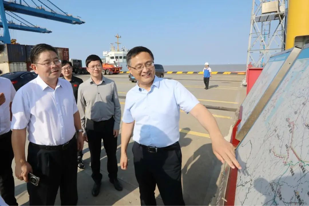 趙守才一行先后來到自動(dòng)化集裝箱堆場、大豐港區(qū)集裝箱碼頭、通用碼頭等地實(shí)地調(diào)研,詳細(xì)了解港區(qū)生產(chǎn)經(jīng)營、發(fā)展規(guī)劃及運(yùn)營管理等情況。
