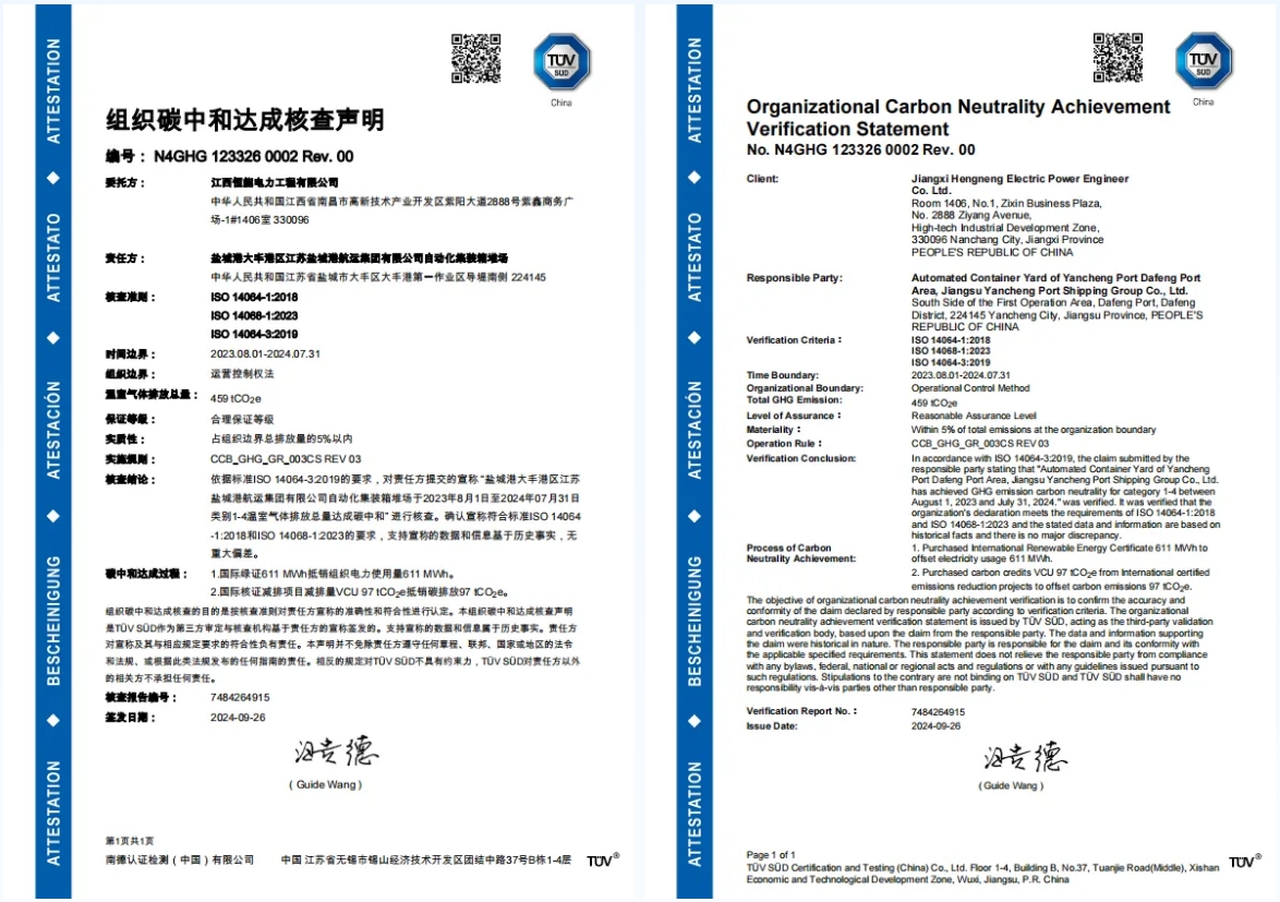 9月26日,鹽城港大豐港區(qū)江蘇鹽城港航運集團有限公司自動化集裝箱堆場獲得TUV南德意志集團頒發(fā)的《組織碳中和達成核查聲明》,成為國內(nèi)首個獲得“碳中和”認證的堆場項目(TUV南德意志集團成立于1866年,總部位于德國慕尼黑,是世界上規(guī)模最大、最古老的TUV檢驗機構)。這是繼2023年鹽城港自動化集裝箱堆場獲得碳中和承諾審定以來,鹽城港在落實國家“雙碳”目標,積極推動港口綠色低碳發(fā)展,奮力為鹽城勇當全省發(fā)展新質生產(chǎn)力重要陣地“碳路先鋒”做出的又一項重要實踐。