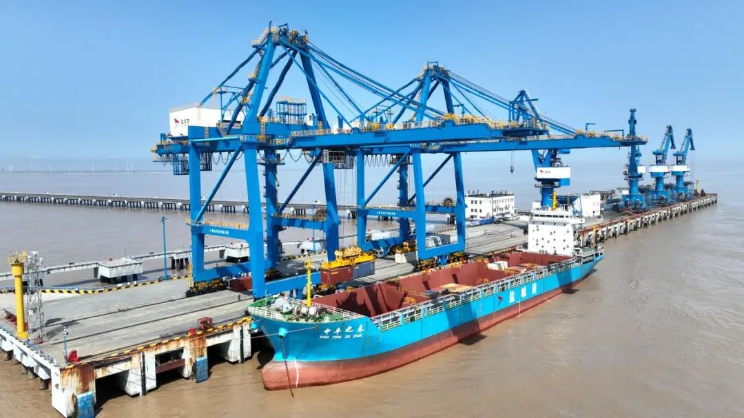 堆場上,堆積如山的集裝箱在秋陽的映照下,閃耀著迷人的光澤。碼頭門機(jī)忙碌地吊運(yùn)著,與秋天的寧靜形成了鮮明的對比。