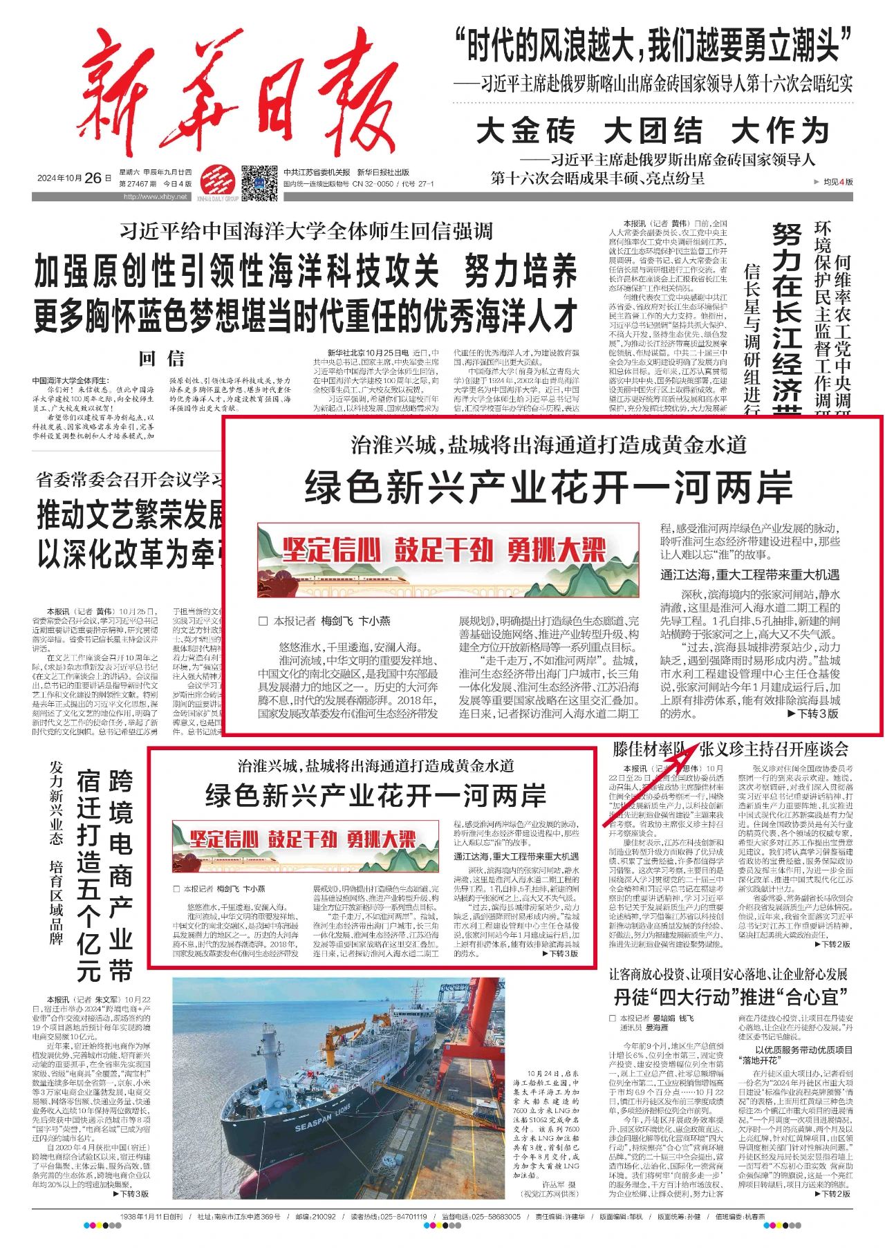 《新華日報(bào)》頭版聚焦鹽城治淮興城,鹽城將出海通道打造成黃金水道